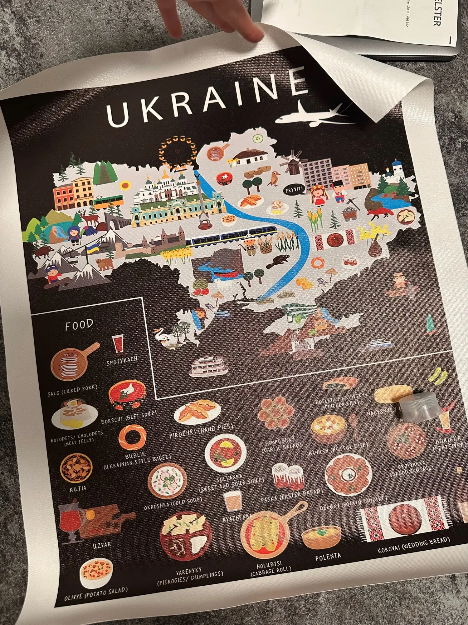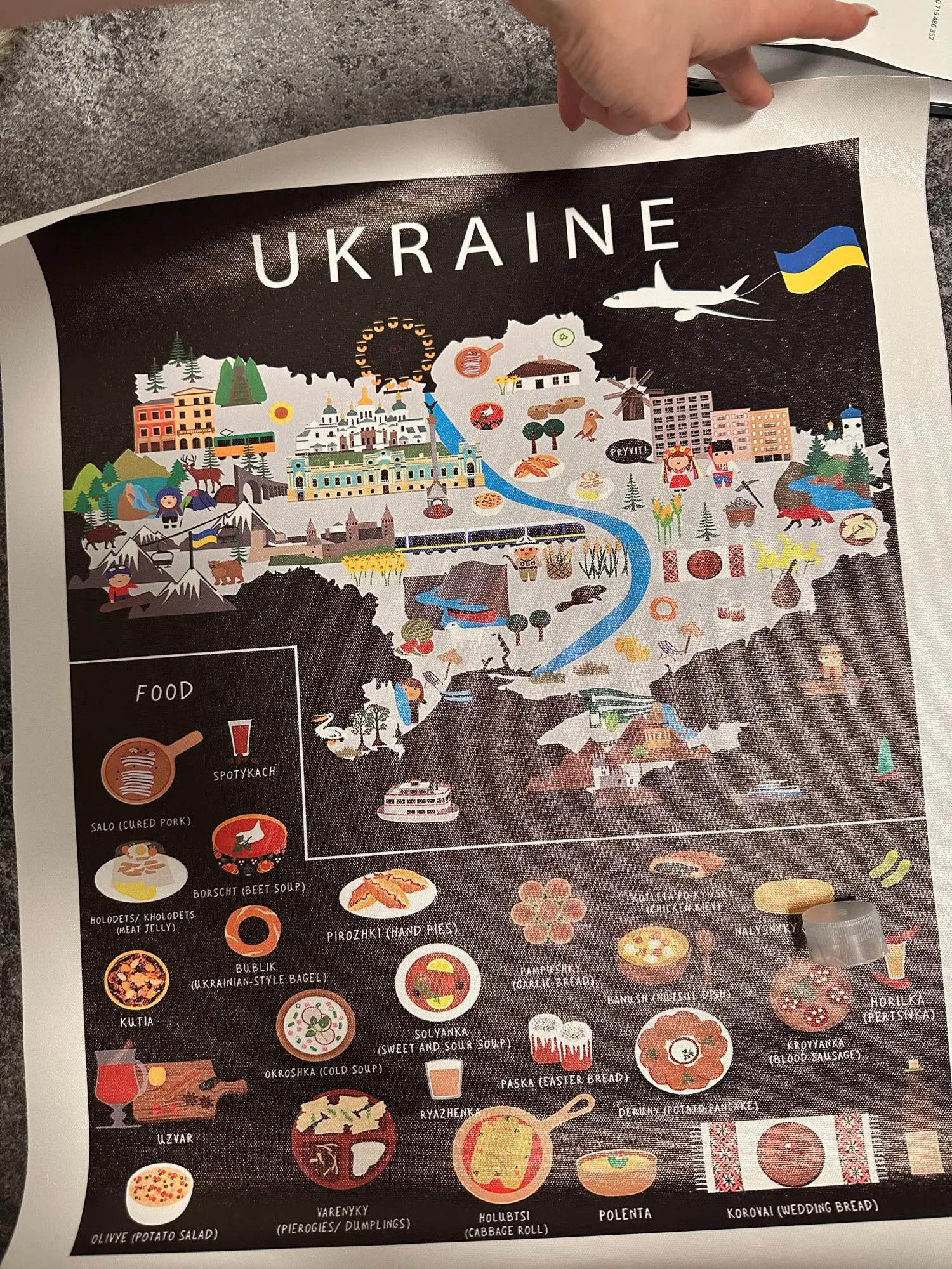 Découvrez notre poster illustré de l'Ukraine, une affiche unique qui met en scène les plats emblématiques, symboles culturels, monuments iconiques et références humoristiques de ce pays fascinant.